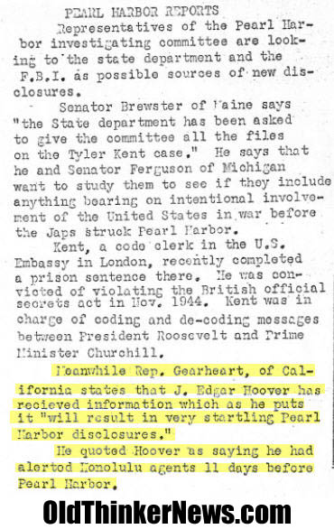 The following is a copy of a 15th of November, 1945 edition of the U.S. Army newsletter called “Homeward Bound”, which I discovered when going through my grandfather’s old documents. Included are several paragraphs discussing “…very startling Pearl Harbor disclosures.” Rep. Gearheart of California is cited as quoting J. Edgar Hoover as saying “…he had alerted Honolulu agents 11 days before Pearl Harbor.”